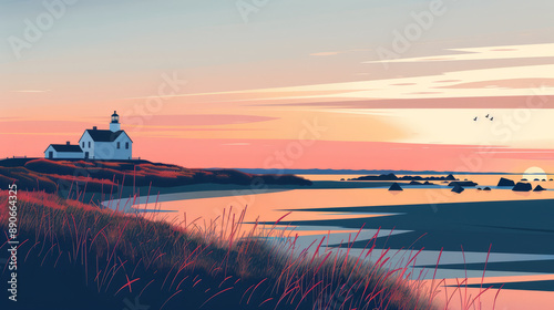 Cape Cod, Massachusetts during sunrise or sunset in minimal colorful flat vector art style illustration.