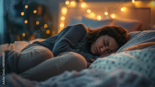 Person holding their stomach in discomfort while lying in bed, stomach pain.