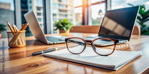 Modern office background highlights a pair of trendy glasses lying on a desk, awaiting their owner, surrounded by papers, pens, and a stylish laptop.