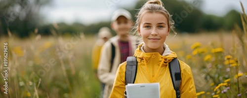 Young female student with backpack explores nature and foliage during an outdoor environmental education field trip or nature excursion surrounded by lush greenery and wildflowers