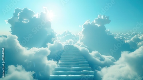 Dark stairway to heaven concept, stairs made of clouds against a blue sky background, creative.
