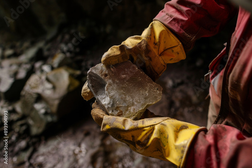 Hands in protective gloves carefully holding a large, rugged rock, deep in an industrial setting, highlighting manual labor and care.