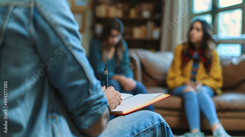 A therapist takes notes during a family therapy session, with two people seated on a couch in the background