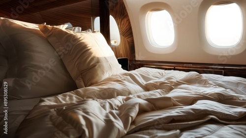This image depicts a luxurious bed setup inside a private jet cabin, focusing on comfort with plush pillows and soft bedding underneath the glow of warm lighting and window views.
