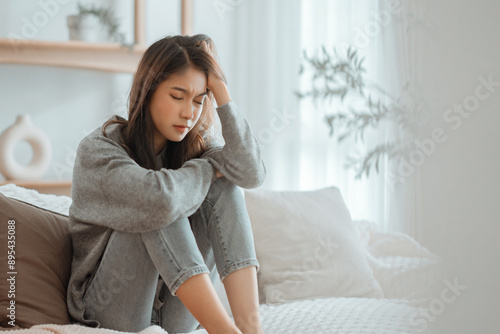 Depressed young woman sitting on couch in the living room at home, Frustrated confused female feels unhappy problem in personal life quarrel break up with boyfriend, copy space