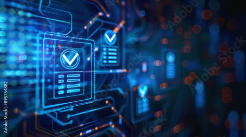 An interactive virtual interface featuring a blue background with compliance standards and policy checkboxes, showcasing adherence to legal requirements