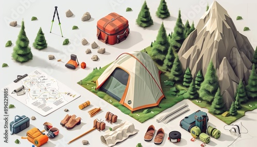 Visualize an ultra-sharp photo showcasing isometric hiking camping infographics, providing