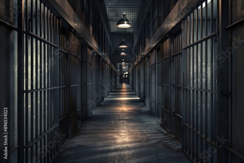 Rows of empty prison cells in a dimly lit corridor, illustrating the stark, isolated environment with a high-quality backdrop