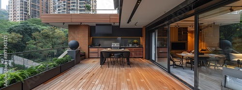 An open air balcony with an outdoor kitchen, fireplace and dining area in the city