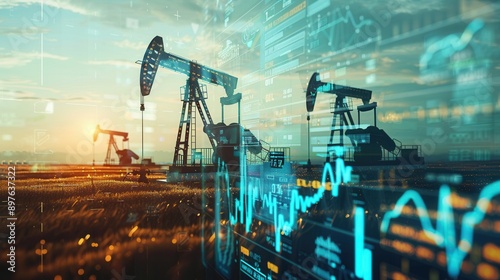 A double exposure image showing oil rigs in a field against a sunset backdrop with superimposed financial graphs and digital data, signifying the rise of gasoline prices. Generative AI