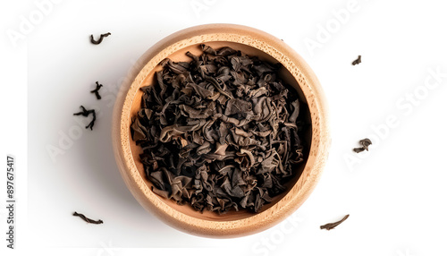 Bowl of traditional Chinese pu-erh tea leaves isolated on white, top view