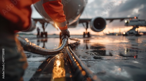 A ground staff member refueling an aircraft on a wet tarmac at dusk, with the reflection of lights and the airplane creating a dramatic and industrious scene.