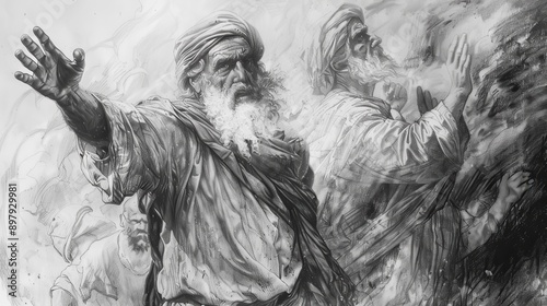 Genesis,The Three Visitors:Modern Bible wall art of Abraham interceding for Sodom, bold pencil sketch with minimalist design on soft beige background biblical illustration,