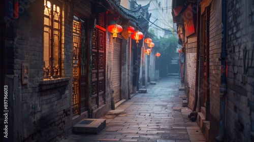 A narrow, empty alleyway bathed in the soft, even light of the early morning