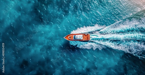 A speedboat in the middle of an ocean, leaving trails behind it, captured from above with a drone camera.