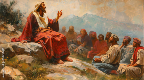 Jesus Christ preaching at the Sermon on the Mount, blessing the poor, the sorrowful and meek, justice, the merciful and peaceable, religion of christianity, bible story