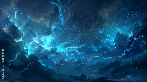 Dark fantasy sky with thunder clouds and blue lightning, in the style of fantasy art, concept art, league of legends splash art