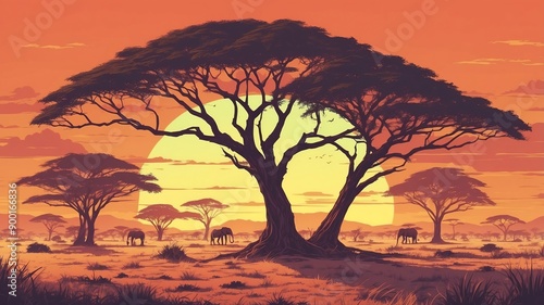 savanna plains with acacia trees retro neon
