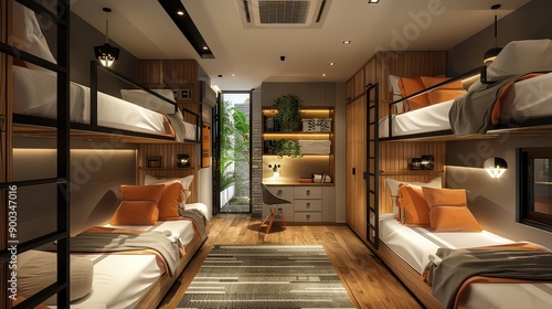 wide shot of a hostel dormitory room with multiple bunk beds, personal lockers, and simple decor, capturing the communal living space.