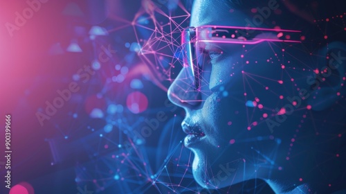 Futuristic Augmented Reality. Woman with Digital Glasses in a Neon Technological Environment