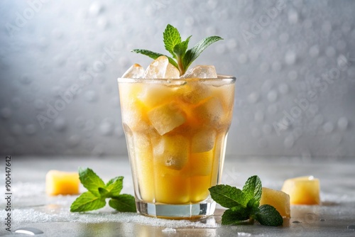 Frozen beverage with ice cubes in a clear glass, condensation dripping, against a crisp white background, refreshing summer treat on a hot day.