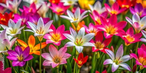 Vibrant Zephyranthes minuta blooms in a kaleidoscope of colors, releasing seeds as they crack open, creating a stunning, sprawling display with ample copyspace.