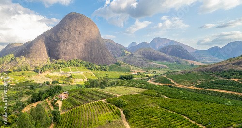 Aerial view of rural landscape of Aguia Branca, ES, Brazil, highlighting conilon coffee plantations set against the backdrop of rocky mountains.