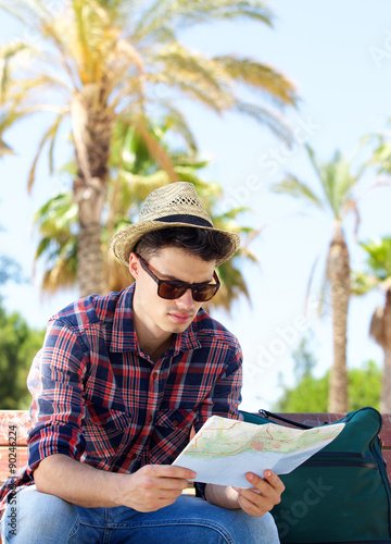 Travel man sitting outside looking at map