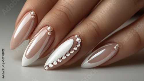 Elegant manicure with pearl and gem accents on almond-shaped nails. Nails are painted in neutral hues with white and nude color design. Perfect for a modern and sophisticated look. AI