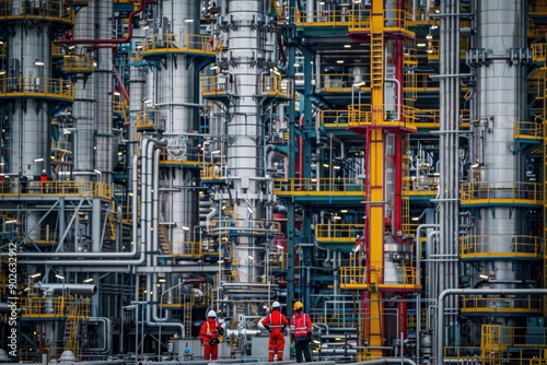 Dedicated personnel in safety gear perform essential maintenance tasks amidst towering industrial machinery.