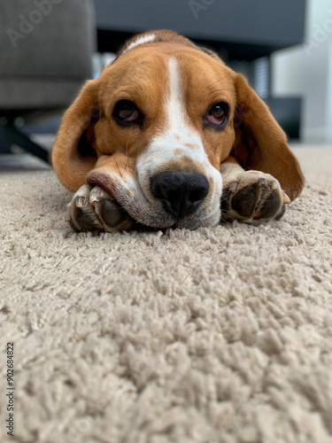 trzyletni pies rasy beagle odpoczywający na dywanie