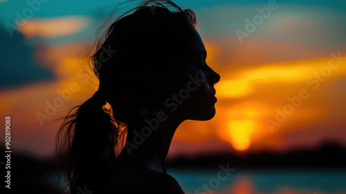 silhouette de profil d'une jeune femme sur fond de couché de soleil en été