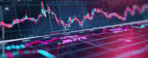 Holographic stock fall, virtual business impact, futuristic price decline, neon tech background