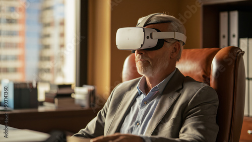 Foto casual de hombre maduro en oficina usando un moderno y discreto visor de realidad virtual, ambiente cálido.