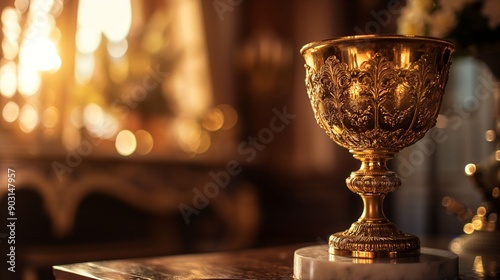 Close-up of a beautifully ornate golden chalice illuminated by sunlight.