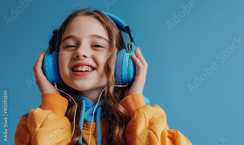 Portret uśmiechniętej dziewczynki w słuchawkach na niebieskim jednolitym tle