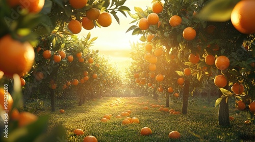 A beautiful fruit orchard with orange trees abundant with oranges, glowing in the afternoon sun.