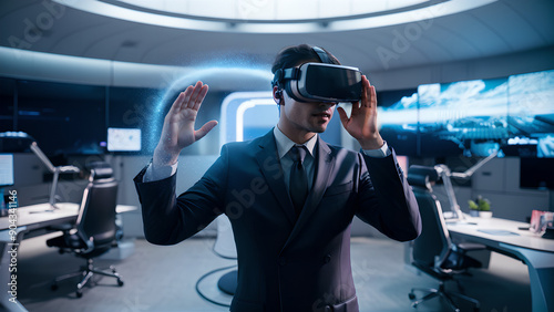 Foto de hombre ejecutivo en oficina usando un moderno y discreto visor de realidad virtual.