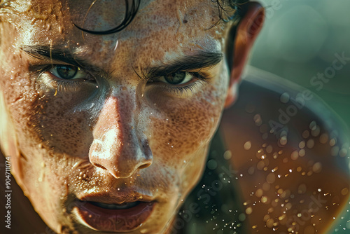 Close-up of a runner’s focused face, showing intense effort and sweat, striving towards a goal