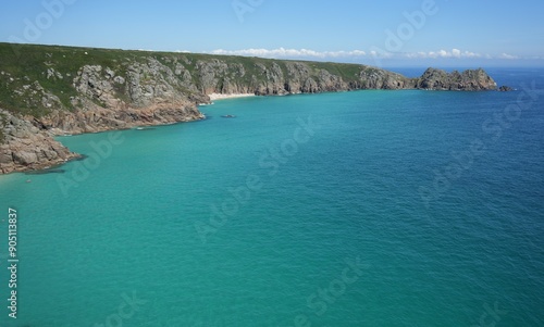 View of Pedn Vounder Beach and Logan Rock surrounded by blue sea. Cornwall, UK.