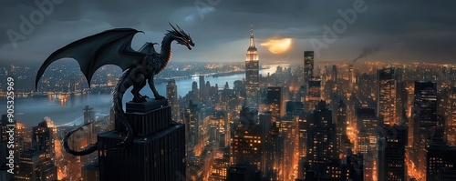 A majestic dragon perched atop a skyscraper overlooking a bustling cityscape at dusk, with glowing lights and dramatic skyline.