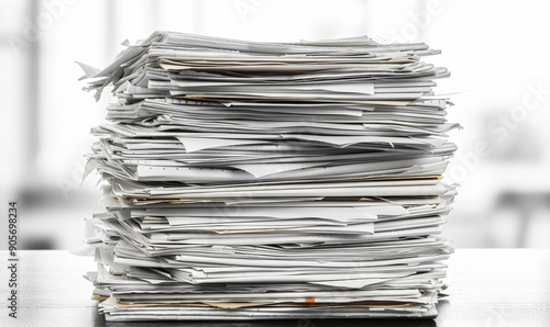 Large Stack of Papers on a Desk, Office Documents, Paperwork Overload, White Background, Work Stress, Busy Workplace, Business Administration, Organizational Chaos