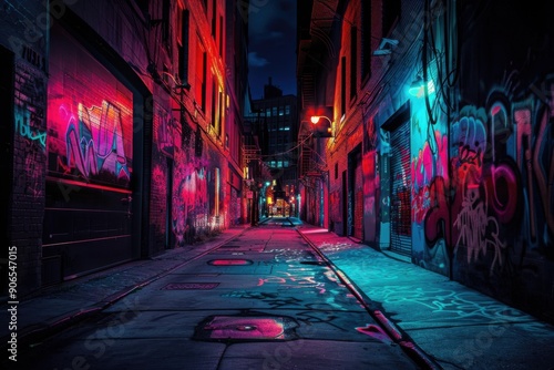 A colorful alley at night featuring vibrant graffiti on brick walls with glowing neon lights.