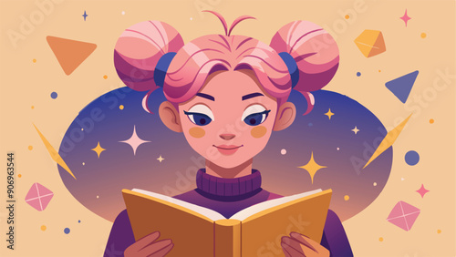 Vector illustration of an adorable child with pink hair, holding a book. The colorful and vibrant design is perfect for educational materials, kids' stories, and character designs.