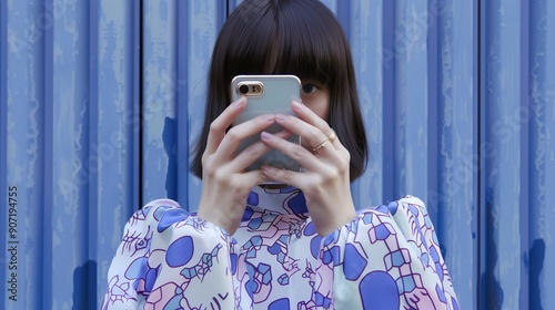 Young girl focused intently on her smartphone against a colorful background, modern children phone addiction problem, doom scrolling, media obsession