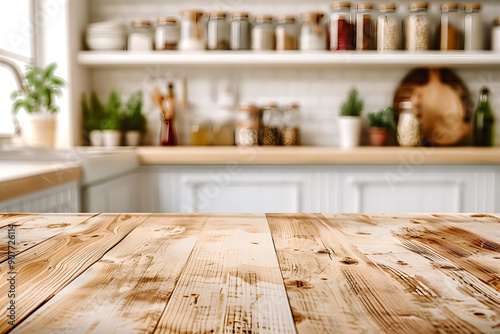 Table en bois en gros plan avec arrière plan flou de cuisine