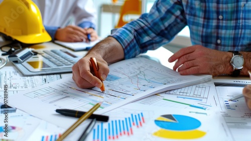Generate a photo realistic image of a construction project team strategizing cost control strategies with detailed financial charts and budgeting tools; ensure the image is of high resolution