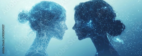 Digital wireframe illustration of twins facing each other in a futuristic background