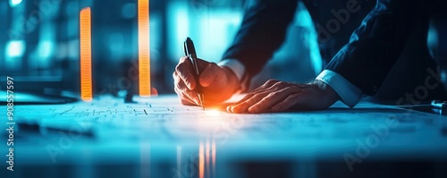 Investigator in a dark room with blueprints and maps, plotting a strategic approach to a high-profile case, tactical planning