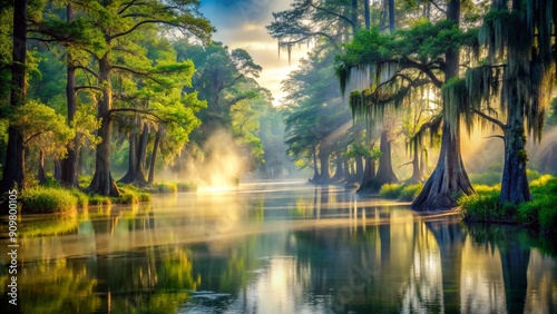 Misty morning light illuminates a serene river winding through a flooded rainforest, surrounded by cypress trees and lush green vegetation in a tranquil bayou setting.